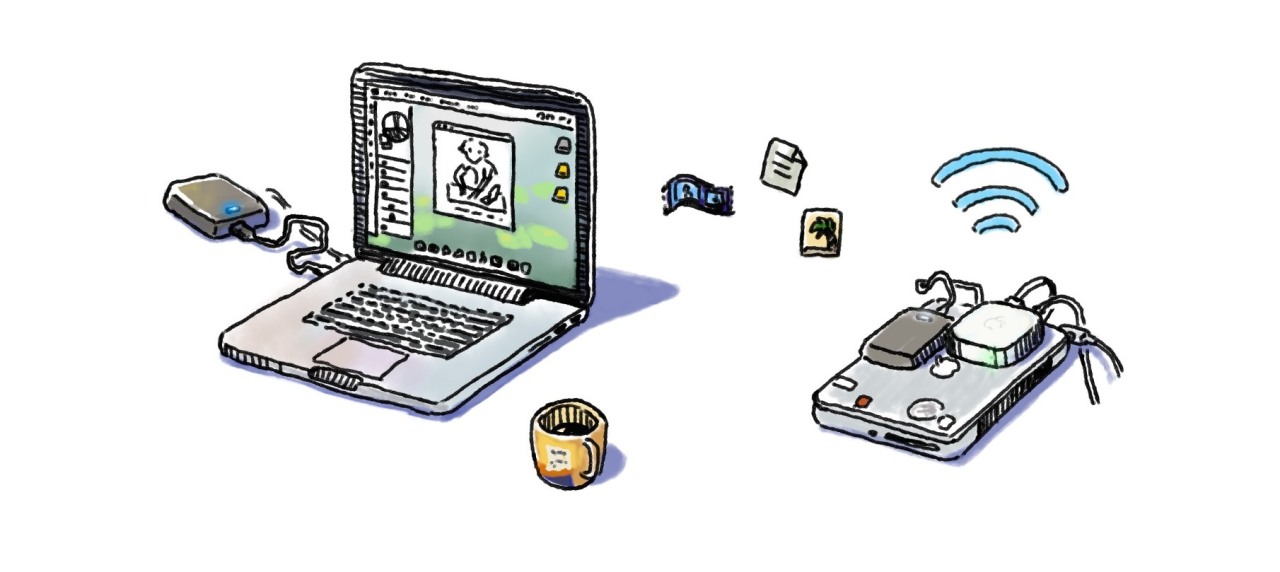 The drawing above shows the connection of my easy “NAS system”. My old MacBook is connected with the 3TB hard drive and an Airport. Through the native file sharing and screen sharing features in Mac OS X I could access the old Macbook and the 3TB hard drive wirelessly, attach them as network drives to my new Macbook’s desktop.